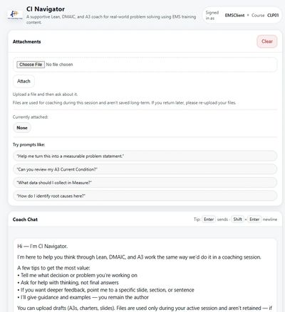 CI Navigator™ is an on-demand Lean Six Sigma coaching assistant designed to support real Continuous Improvement, DMAIC, and A3 problem-solving work — directly inside your e-learning system.